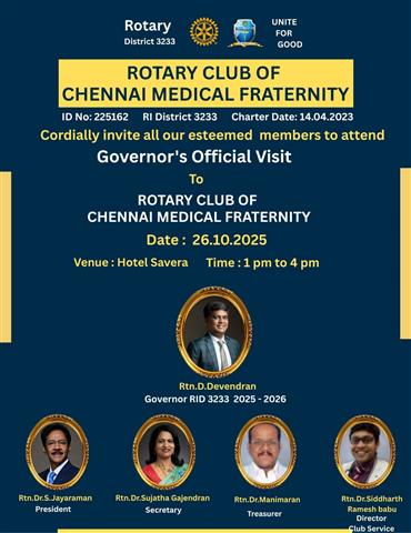 Governor’s Official Visit for Rotary Club of Chennai Medical Fraternity,RID 3233